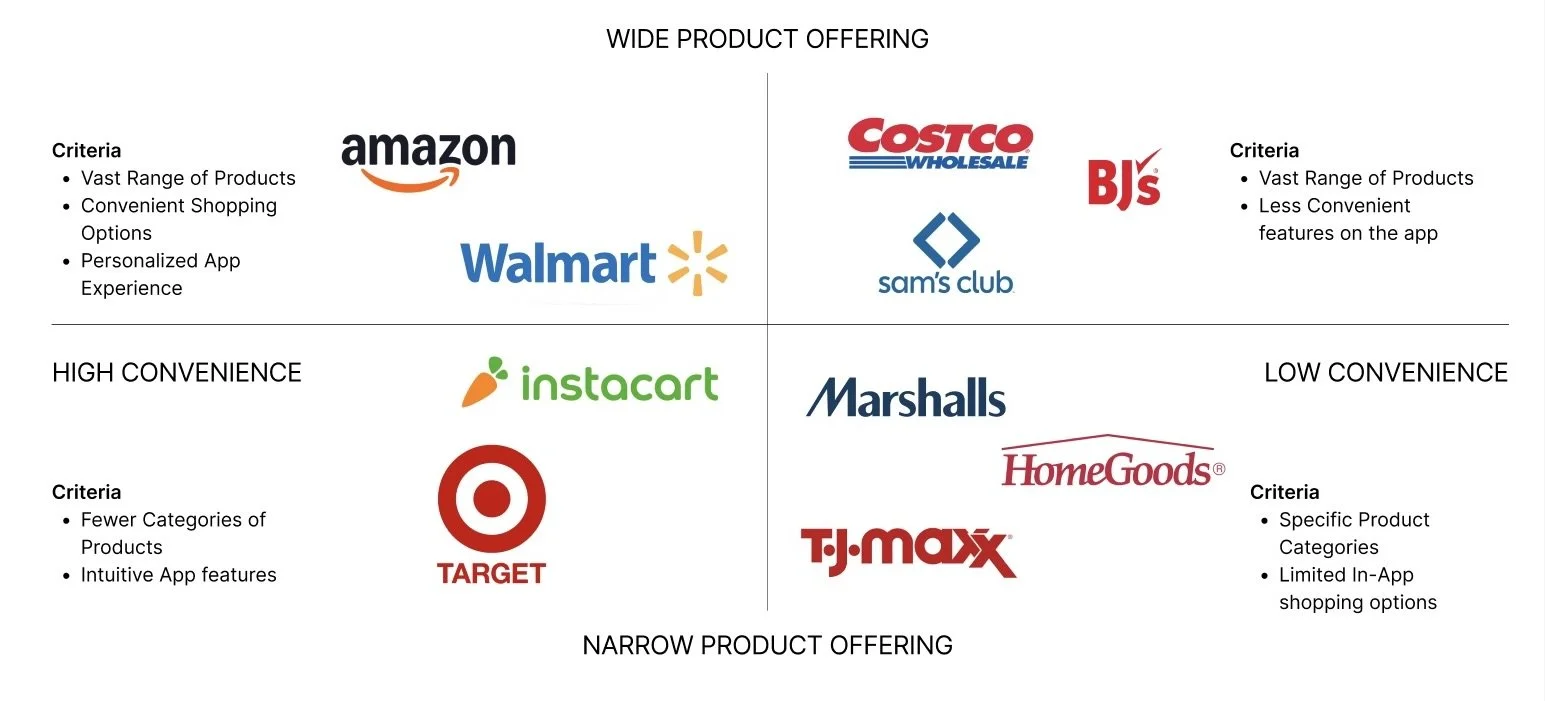 We conducted a competitive analysis, comparing Costco’s app with both direct and indirect competitors to evaluate their features and user flows. Using our heuristic findings as a guide, we identified the strengths and weaknesses of each competitor. Key areas we examined included: