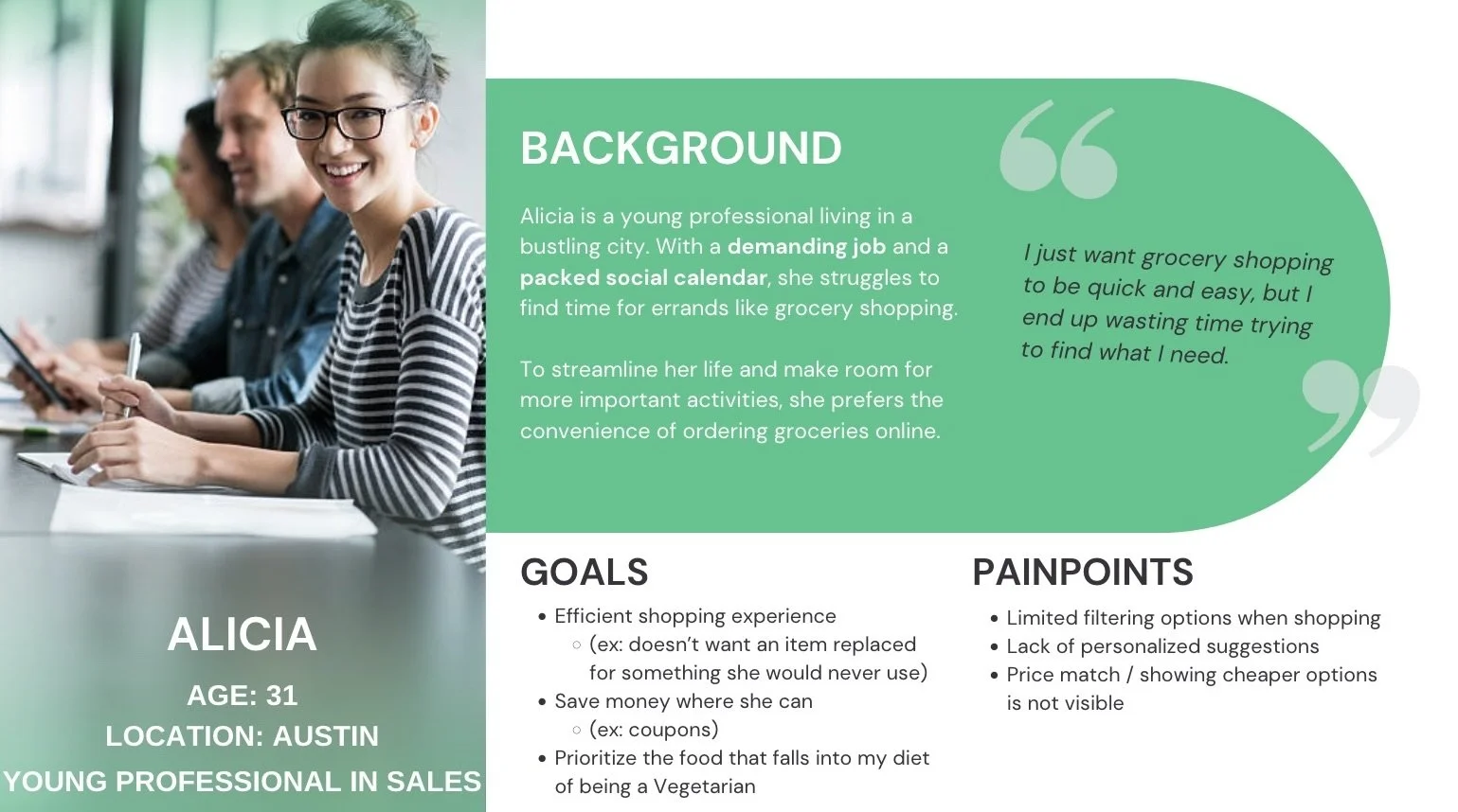 After conducting user interviews, we refined our scope by defining our user persona. Key areas we examined included: