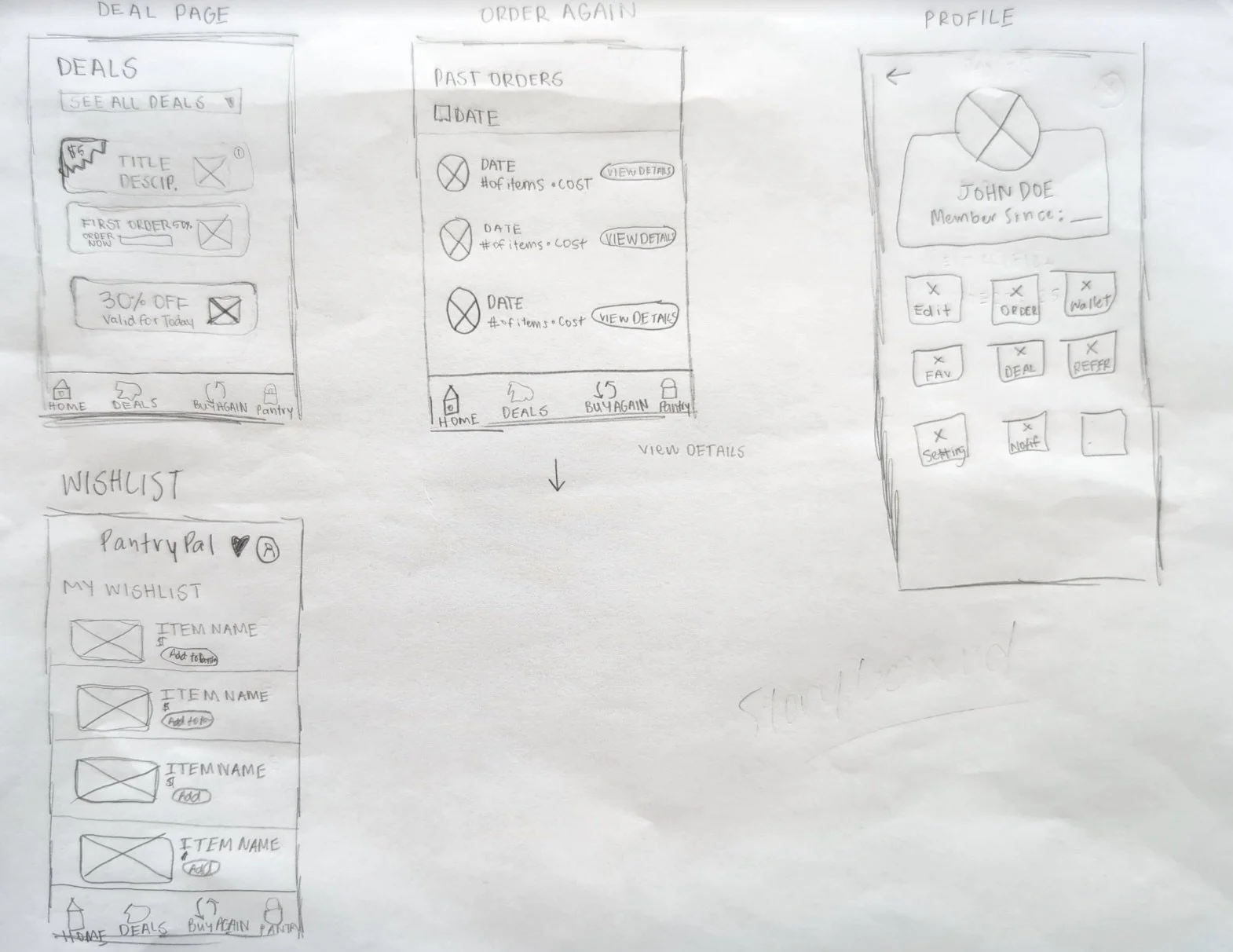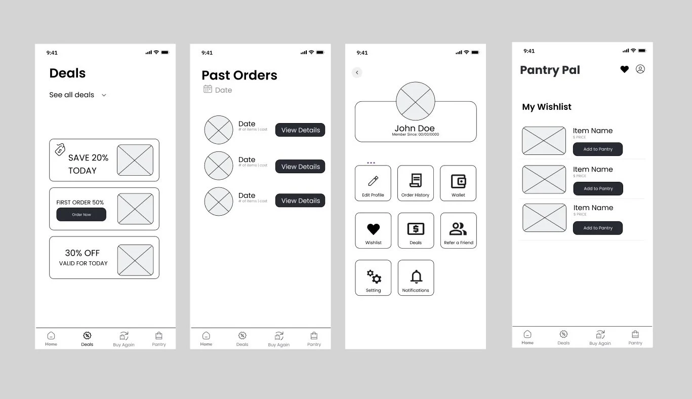 The image to the right demonstrates unique features that Pantry Pal offers to their users. We have a deals page, past orders page, profile page, and a wishlist page.