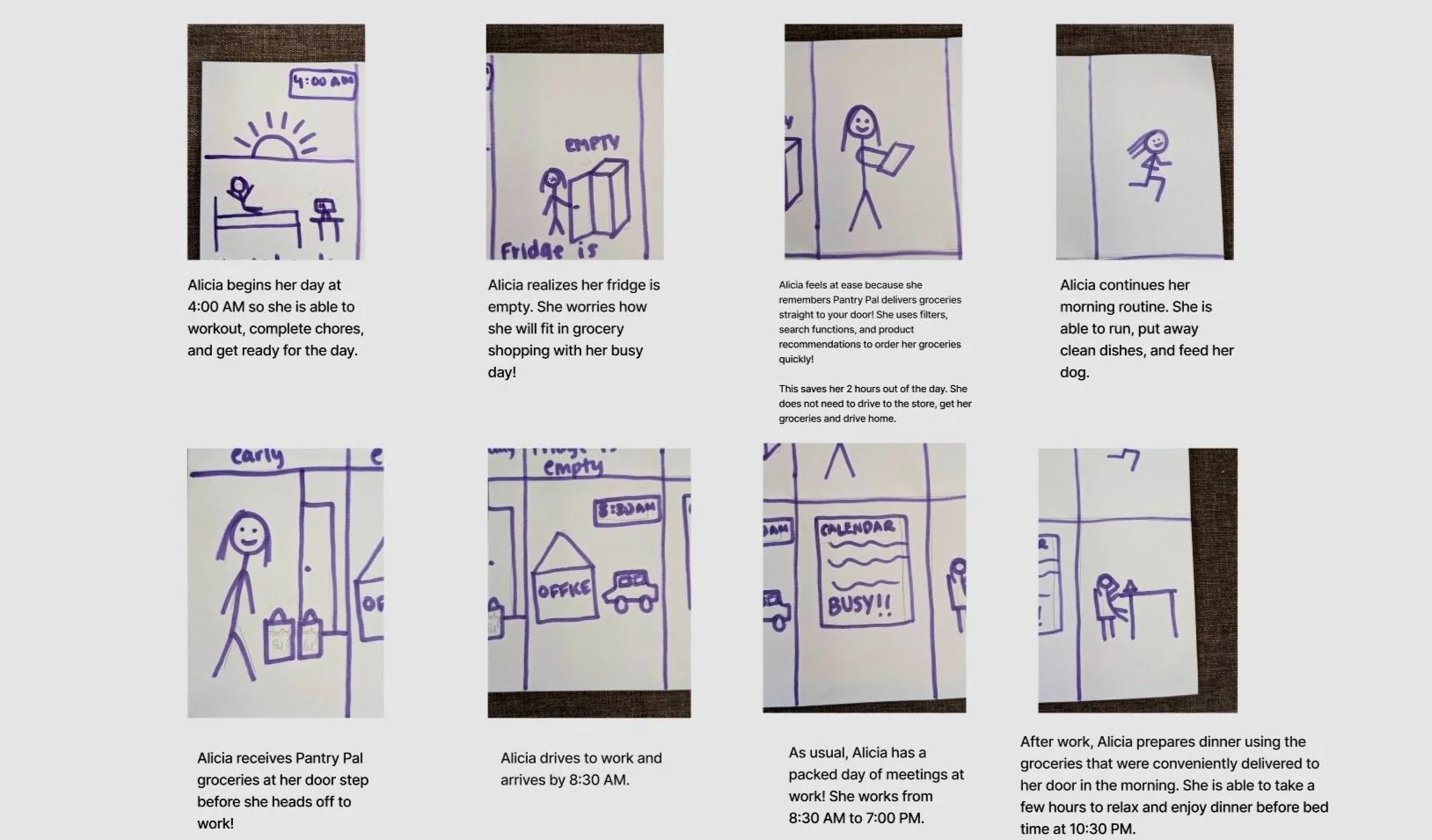 After completing story mapping, the team created a storyboard to outline the needs and subtasks related to a packed schedule leaving little time for grocery shopping. The first two panels highlight the pain points of a busy young professional: a hectic schedule and the inability to find time for grocery shopping. The subsequent panels showcase the advantages of scheduling grocery deliveries in advance.