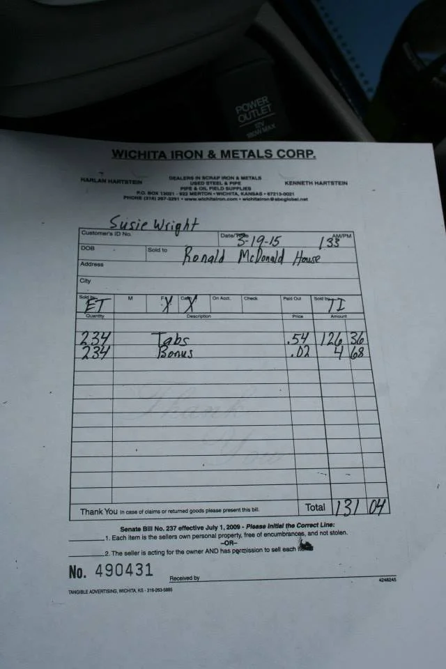 I collected 234 pounds of tabs, raising $126.36—and thanks to a bonus from Wichita Iron and Metal, the final donation totaled $131.04 for Ronald McDonald House Charities.